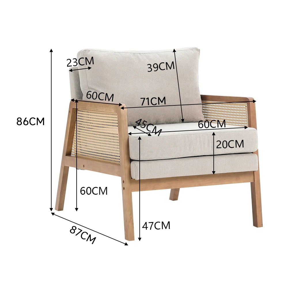 Frame: Wood + Rattan | Upholstery: Fabric | Fill: 28D Foam