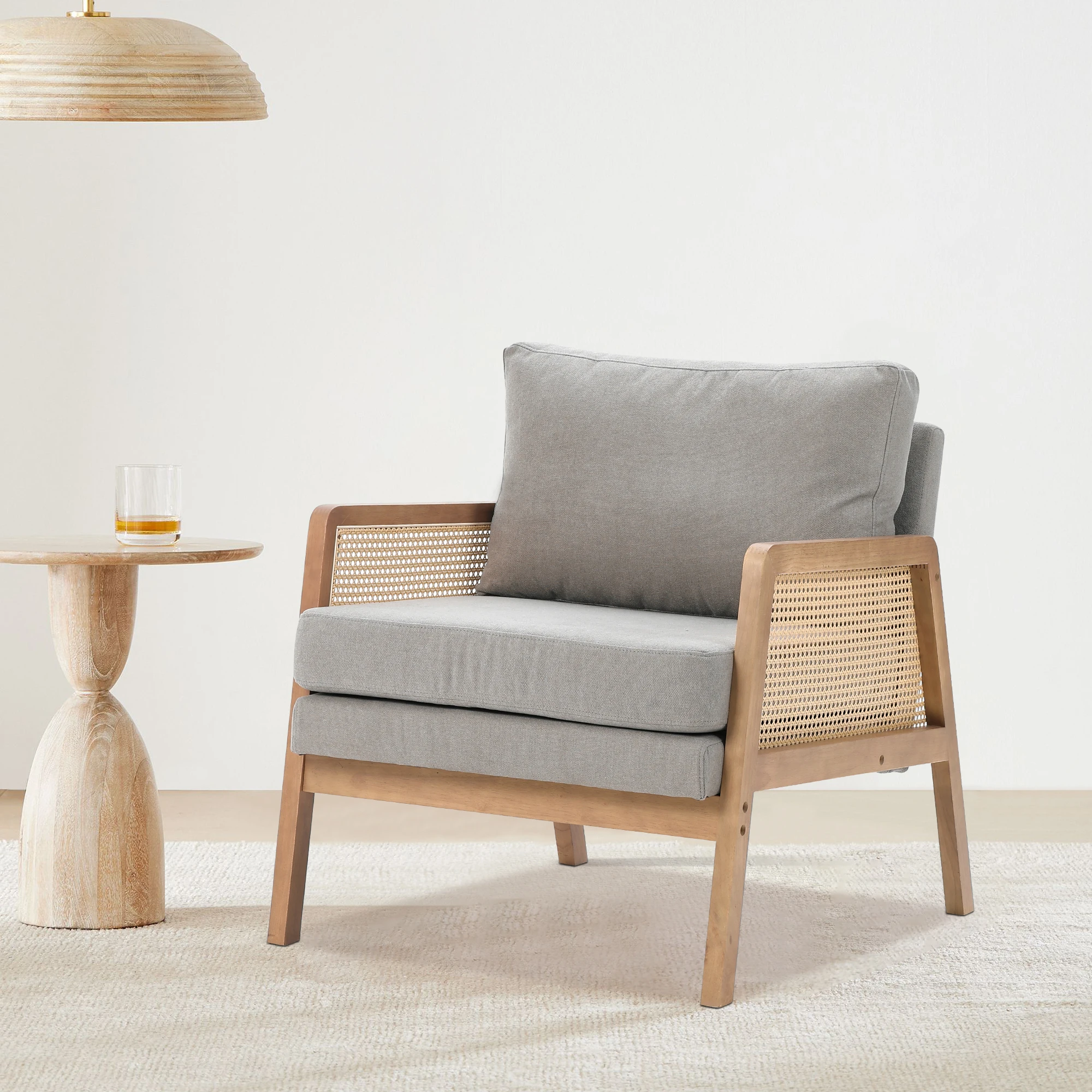 Add style and comfort to any room with this mid-century-inspired armchair. Featuring a wooden frame with woven rattan sides, fully cushioned seat and back, and soft fabric upholstery, it offers both rustic charm and cozy seating.